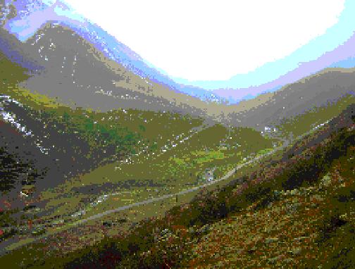 We turn around and take in the beauty of Twelve Chimneys. In the few moments we’ve spent climbing on our hands and knees over a patch of scree, the clouds have lifted and a mountain coloured deep green and purple with grass and lichen is looming out of the mist opposite us. The valley is so narrow it seems almost close enough to touch.