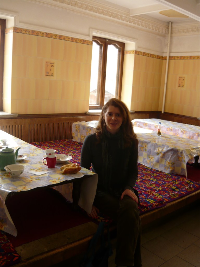 Around lunchtime we start passing restaurants on both sides of the road — apparently we have reached the halfway point from Bishkek to Osh — and the driver draws up to one, the Altyn (‘golden’) something. Pelmeni (meat dumplings) in a clear broth are served up. I eat the lipyoshka bread, and sip the tea, poured out by Asana.