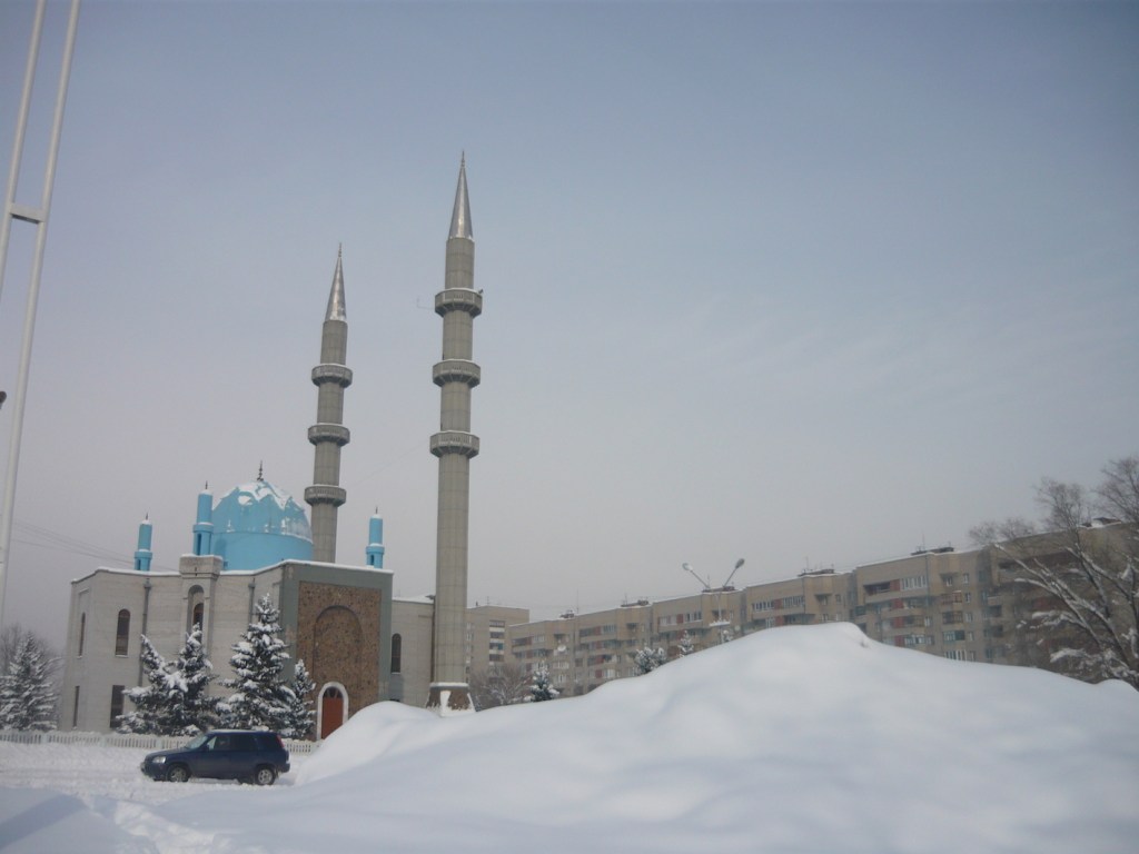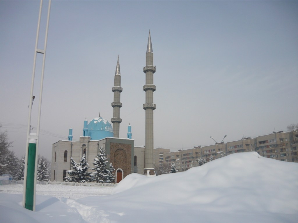 Seeing buildings emerge from a howling blizzard gives a different impression from viewing them on a clear, sunny day. One of the Oskemen (also known by its Russian name Ust-Kamenogorsk) landmarks that made the biggest impression on me was the Muhamadi Mosque which — as the photos show — looks very like a Disney castle – or it would if it wasn’t surrounded by Soviet era apartment blocks.