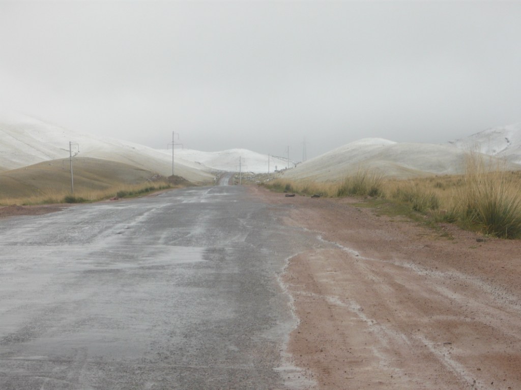 It was getting steadily colder, and there was snow on the higher peaks, and a thin sleet fell on the car in places.