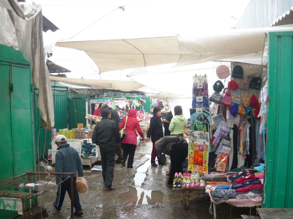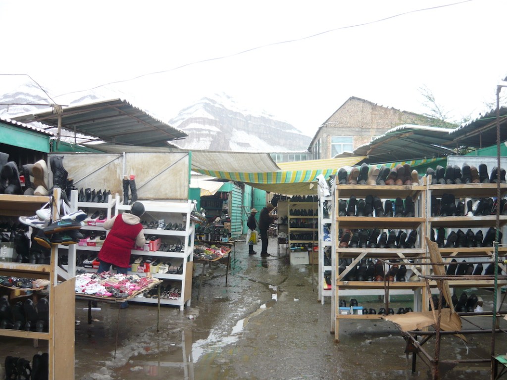 Beyond the snow-laden awnings and cheap plastic goods from China, the mountains spiked upwards into the white-grey sky.