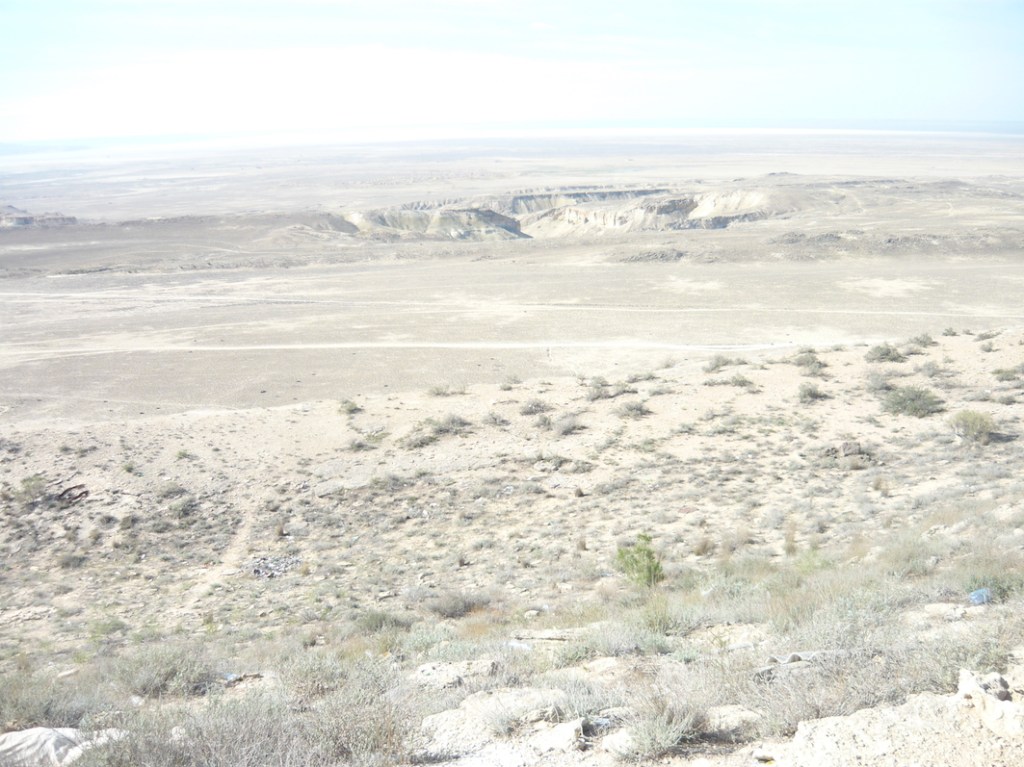 Past Aktau’s concrete blocks, we entered the desert, an expanse of greyish sand broken up by rocks and occasional dead-looking bushes. We were in the Caspian Depression, which is one of the lowest points in the world at 130 metres below sea level (it used to be under the Caspian Sea). Temperatures here can rise as high as 60C in summer, and that day’s forecast for Zhanaozen was 38C even though it was already September.