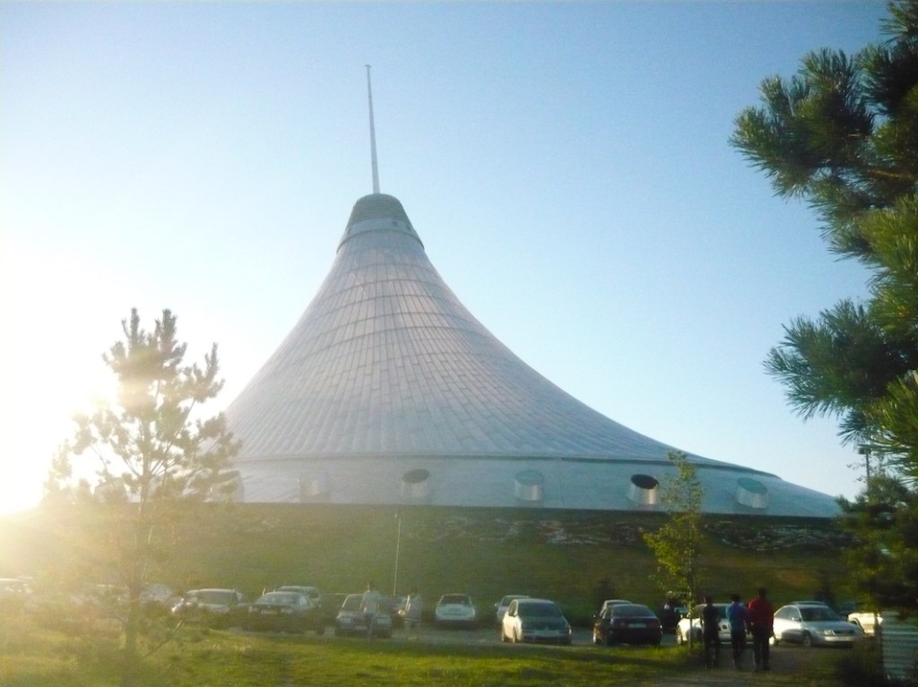 Astaninkis flocked to Khan Shatyr, which was one of several Astana landmarks designed by the British architect Norman Foster, and was supposed to resemble a giant tent, a modern riff on the traditional Kazakh yurt. It wasn’t actually a tent, but the roof of the circular building looks as if it’s draped over a tent pole, swooping upwards to a slightly off-centre spire. (A bit like a tent put up like a Glastonbury goer after a few too many hallucinogenic drugs.)