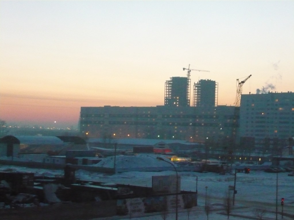 By May, the snow had gone and the side of the road that had been steppe was full of new building sites. The apartment was in the Olimp Palace, a giant brand new development that took up an entire block. Entry was up a ramp and through a security gate manned by a guard in a small kiosk. This led into a large quad – dvor in Russian – surrounded by dark grey-green buildings.