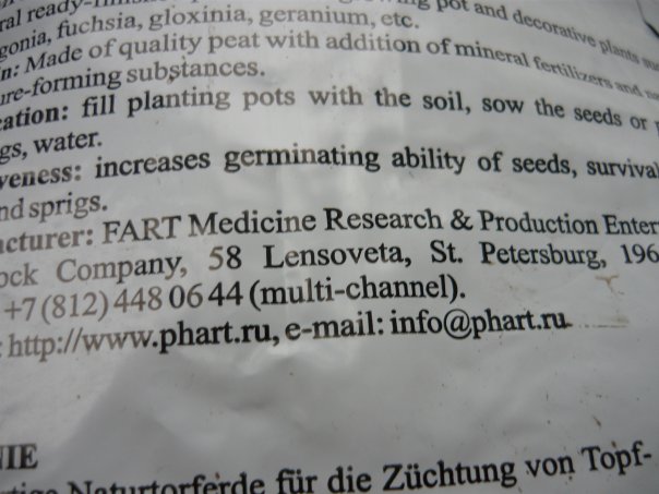 More windy marketing from FART Medicine Research & Production Enterprise of St Petersburg, which produced a bag of potting compost I bought in Almaty, Kazakhstan.